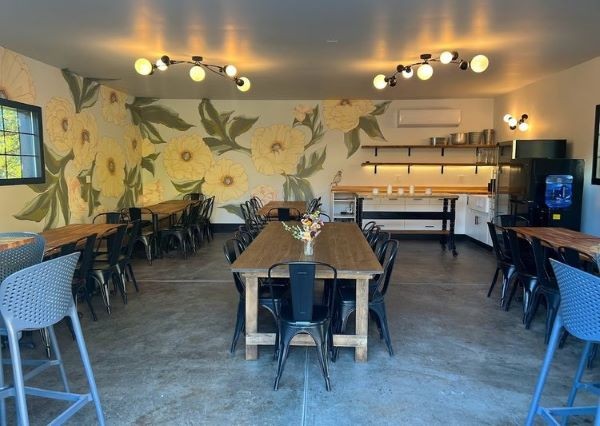 The Quail, is a versatile and charming indoor space, featuring a kitchenette area, a vintage rolling bar, and custom peony mural to bring the outdoors in. With large glass doors you can open the space to food trucks and caterers. Space holds 36 seated.